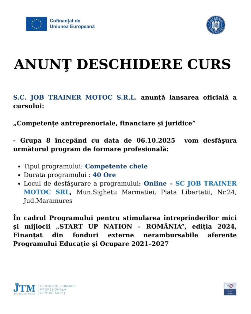 S.C. JOB TRAINER MOTOC S.R.L. anunță lansarea oficială a cursului: