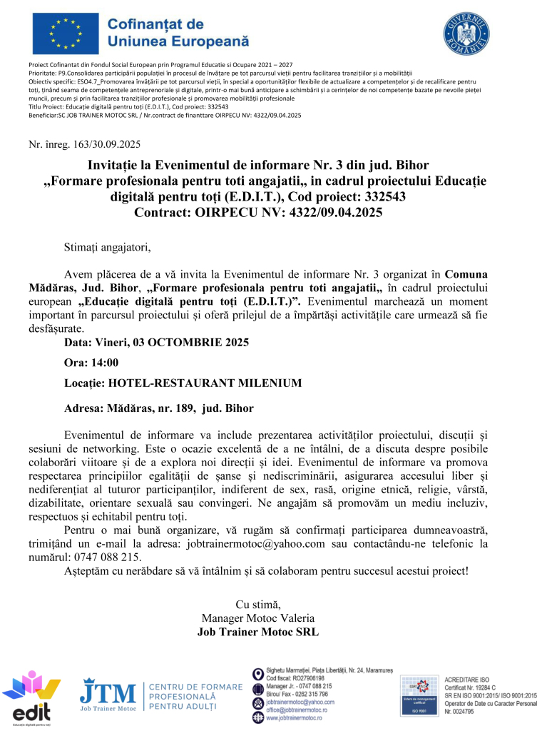 Avem plăcerea de a vă invita la Evenimentul de informare Nr. 3 organizat în Comuna Mădăras, Jud. Bihor, ,,Formare profesionala pentru toti angajatii,, în cadrul proiectului european „Educație digitală pentru toți (E.D.I.T.)”. Evenimentul marchează un moment important în parcursul proiectului și oferă prilejul de a împărtăși activitățile care urmează să fie desfășurate.